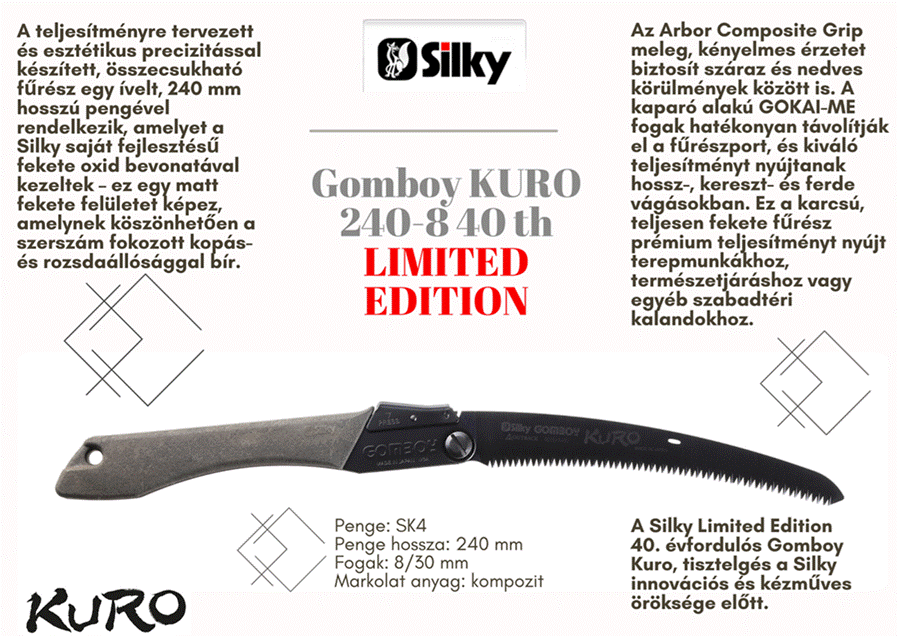 A Gomboy KURO 240-8 40th fűrész, méltó tisztelgés a Silky páratlan öröksége előtt, egy igazi gyűjtői darab.